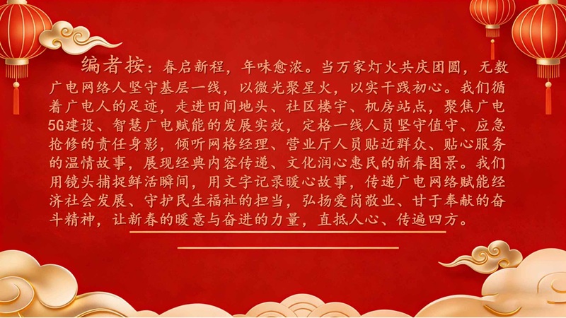 从营业厅到社区街巷,从机房值守到上门维修,每一个岗位都在坚守,每一份付出都有意义。线路巡查、设备检修、故障排除、反诈宣传、暖心慰问,有线人用脚步丈量责任,用汗水守护信号,用服务传递真情。他们错过了家里的团圆饭,错过了春晚的精彩开场,却守住了千家万户的视听畅通,守住了年味儿里的安心与幸福。
